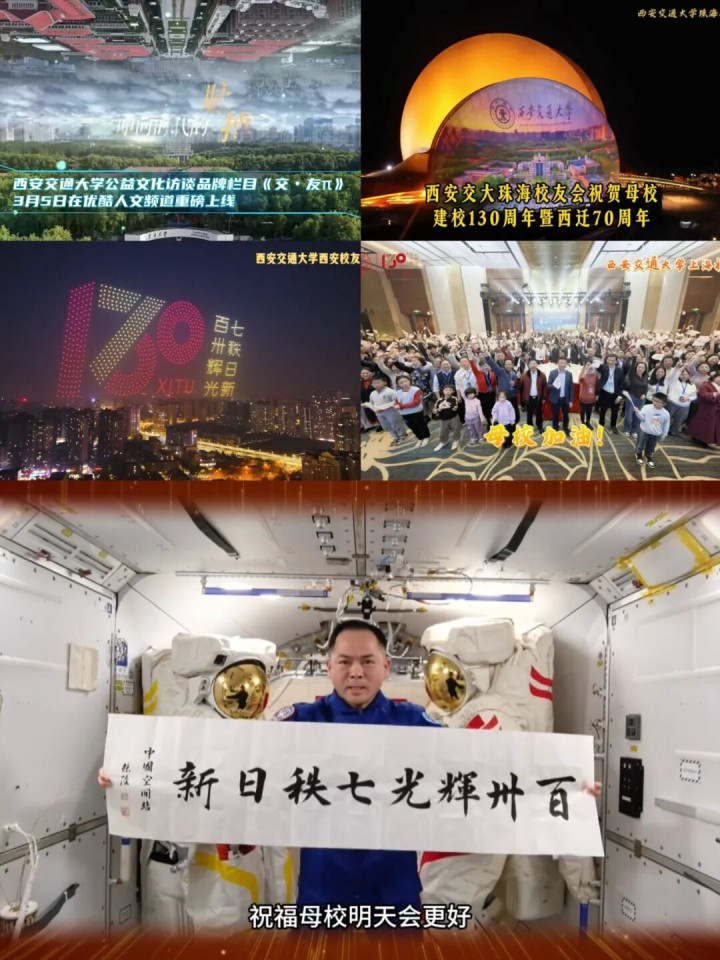 恰逢3月14日“外洋圆周率日”,行为现场发布了西安交大原创公益文化访谈品牌栏目《交·友π》和全球学友的祝贺短片。在短片中,我国航天员、西安交大学友张陆从中国空间站送来致敬,并书写“百卅辉光 七秩日新”书道作品奉上祝贺。交大各地学友们也通过“点亮城市地标”“录制祝贺视频”等面容,向母校130周年华诞深情广告。