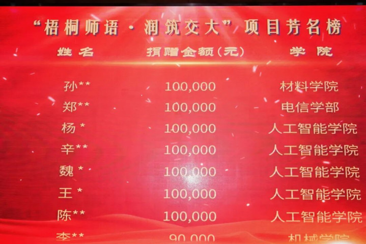 戒指现在,学校累计收到校内教职工捐赠款项已冲破1.6亿元,其顶用于支捏宪梓堂改良的“梧桐师语·润筑交大”式样已收到1900东谈主次、1500余万元的捐赠。