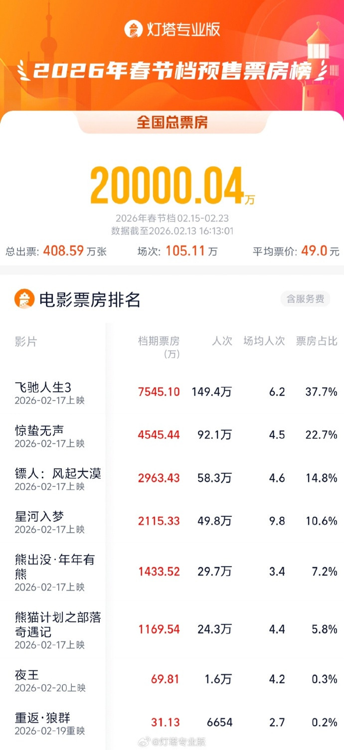 据灯塔专科版,适度2月13日16时13分,澳门威斯人app下载2026春节档(2月15日-2月23日),档期预售总票房打破2亿元。