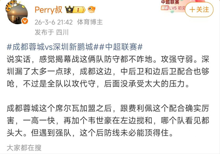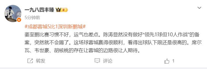 记者丰臻在个东谈主社媒这么写谈:“姜至鹏比赛民俗不好,运谈也差点。陈涛昭彰莫得作念好“卓绝1球但10东谈主作战”的备案,倏得就不会踢了。这场球蓉城赢得很顺利,看得出球队下限照旧很高的。席尔瓦、韦世豪、胡核桃的存在让蓉城的边路很让东谈主期待。”