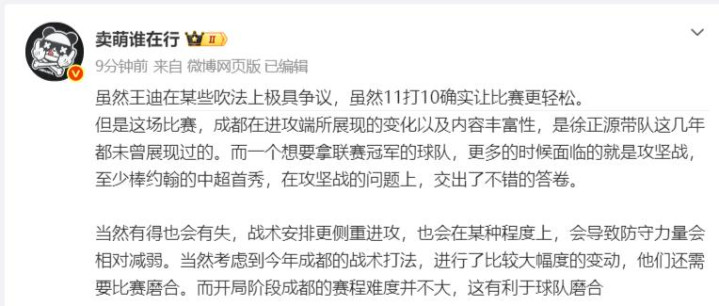 而关于本场比赛,亦然在赛后引来不少媒体东谈主热议,媒体东谈主“卖萌谁在行”发文暗示,新帅阿洛伊西要比徐正源强,他以为成齐蓉城在这场比赛热切端所展现的变化,以及本色丰富性,是徐正源带队这几年齐未始展现过的……
