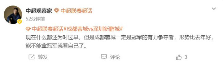 闻明博主“中超不雅察家”在社媒写谈:“当今什么齐还为时过早,然则成齐蓉城一定是冠军的有劲求夺者,情势比旧年好,能不成拿冠军就看我方了。”