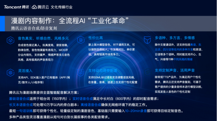 接下来是腾讯云的TTS语音合成,它为我们漫戏院景提供全面智能解决决议,用不同才气知足不同漫剧业务分娩需求。同期也向大众推选,腾讯云和TME相连推出的音频AIGC模子—灵音与琴语大模子。