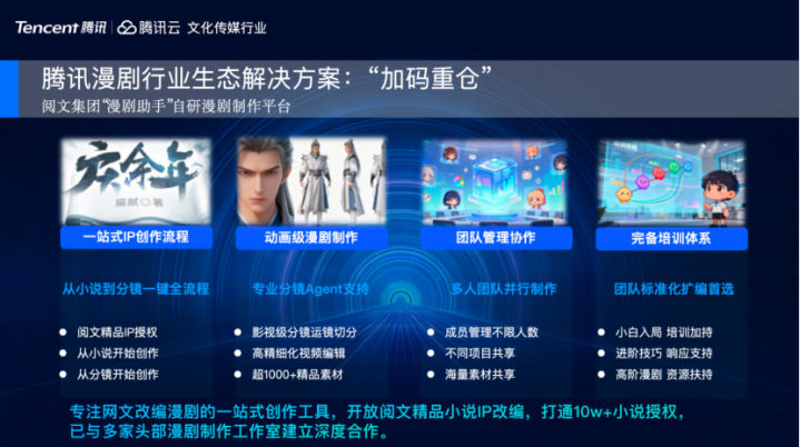 刚才提到全链路、一站式漫剧制作平台,就是我们和阅文集团相连推出的漫剧助手,从演义分镜到专科Agent支抓,到团队并行制作。这款产物亦然行业头部酱油文化一直参与内测、抓续打磨,配合阅文集团推出的平台器用。