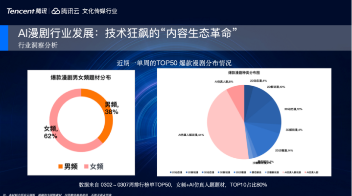 先看一组数据,我们就前两周的榜单作念了整理,发现女频仍是占据大部分商场,占比约60%,赫然漫剧仍是从2025年男频主导的商场环境,休养到女频,女频恰是通过与近期爆火的AI仿真东说念主讲解漫与短剧深度绑定,竣事了商场份额冲破。