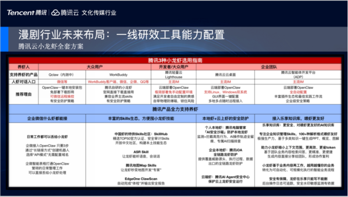最初是最近爆火的小龙虾;我们不仅为大众用户提供了QClaw,还有WorkBuddy;对于个东说念主拓荒者也提供了腾讯轻量云劳动器,对于企业团队,我们要点推出腾讯云桌面、腾讯云智能体拓荒平台与ClawPro。