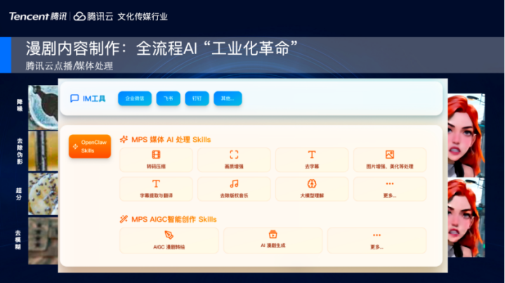 而在OpenClaw爆火后,腾讯云点播团队也额外赶紧,作念好了产物才气的skills才气封装,把产物中枢功能,举例超分、AI漫剧一键转绘、AI漫剧讲解漫生成,皆封装到skill才气中。我们近期有在腾讯云视频号上进行视频共享,大众也可以径直调用skill进行体验。