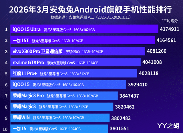 具体来说,在2026年3月份安兔兔安卓旗舰手机性能名次榜中,iQOO 15 Ultra和一加15T分列第别称和第二名。在安兔兔平台上,这两款智妙手机的平均跑分永别为4174911分和4164561分。其中,iQOO 15 Ultra这款智妙手机经受了新的缱绻话语,并装有主动散热电扇与肩键,其散热系统配备了尺寸较大的电扇和大面积孤立风谈,通过冷热空气交换进行散热。