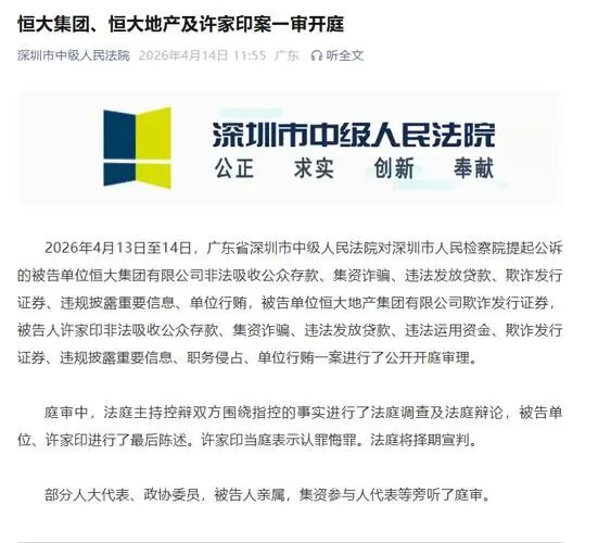 2026年4月13日至14日,广东省深圳市中级东说念主民法院对恒大集团、恒地面产及许家印案进行了一审公开开庭审理。许家印当庭对罪人摄取公众入款、集资骗取、作歹披发贷款、职务侵占等多项罪名示意认罪悔罪,法庭将择期宣判。