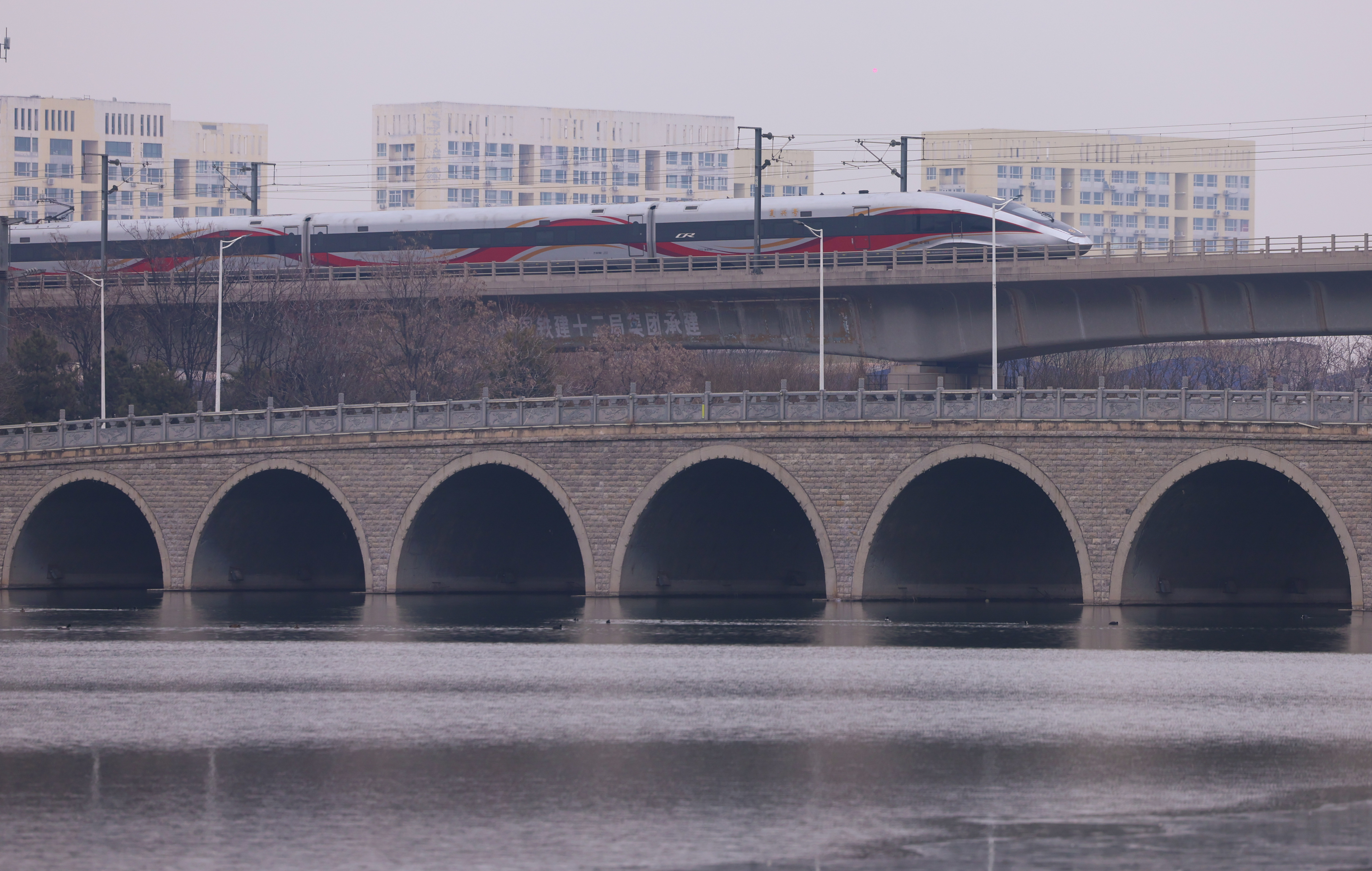 ↑ 1月25日,动车组列车行驶在天津市境内(无东说念主机相片)。新华社发(杜鹏辉 摄)