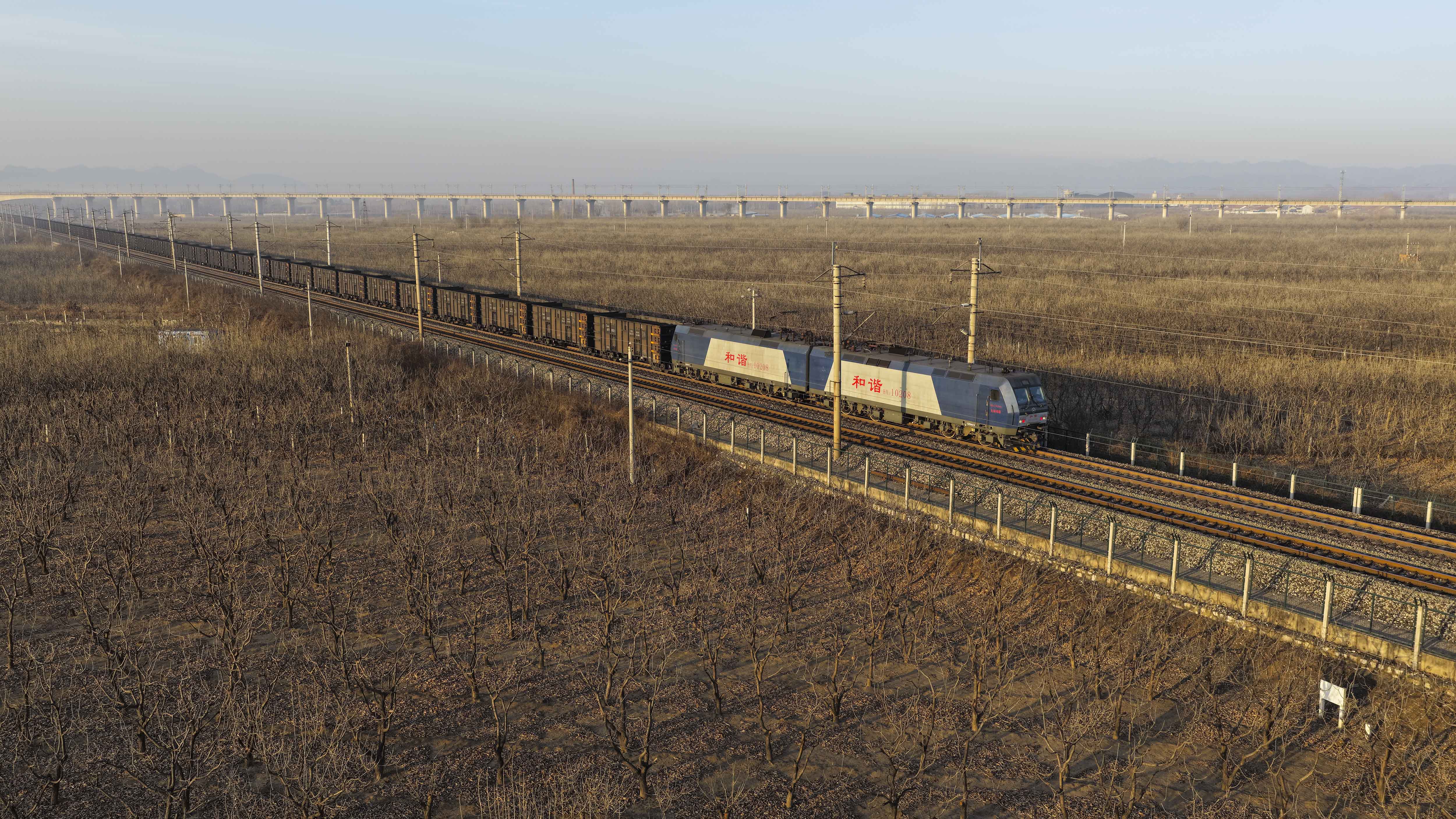 ↑ 1月25日,一列运煤专列路过大秦铁路河北省遵化市境内驶向秦皇岛标的(无东说念主机相片)。新华社发(刘满仓 摄)