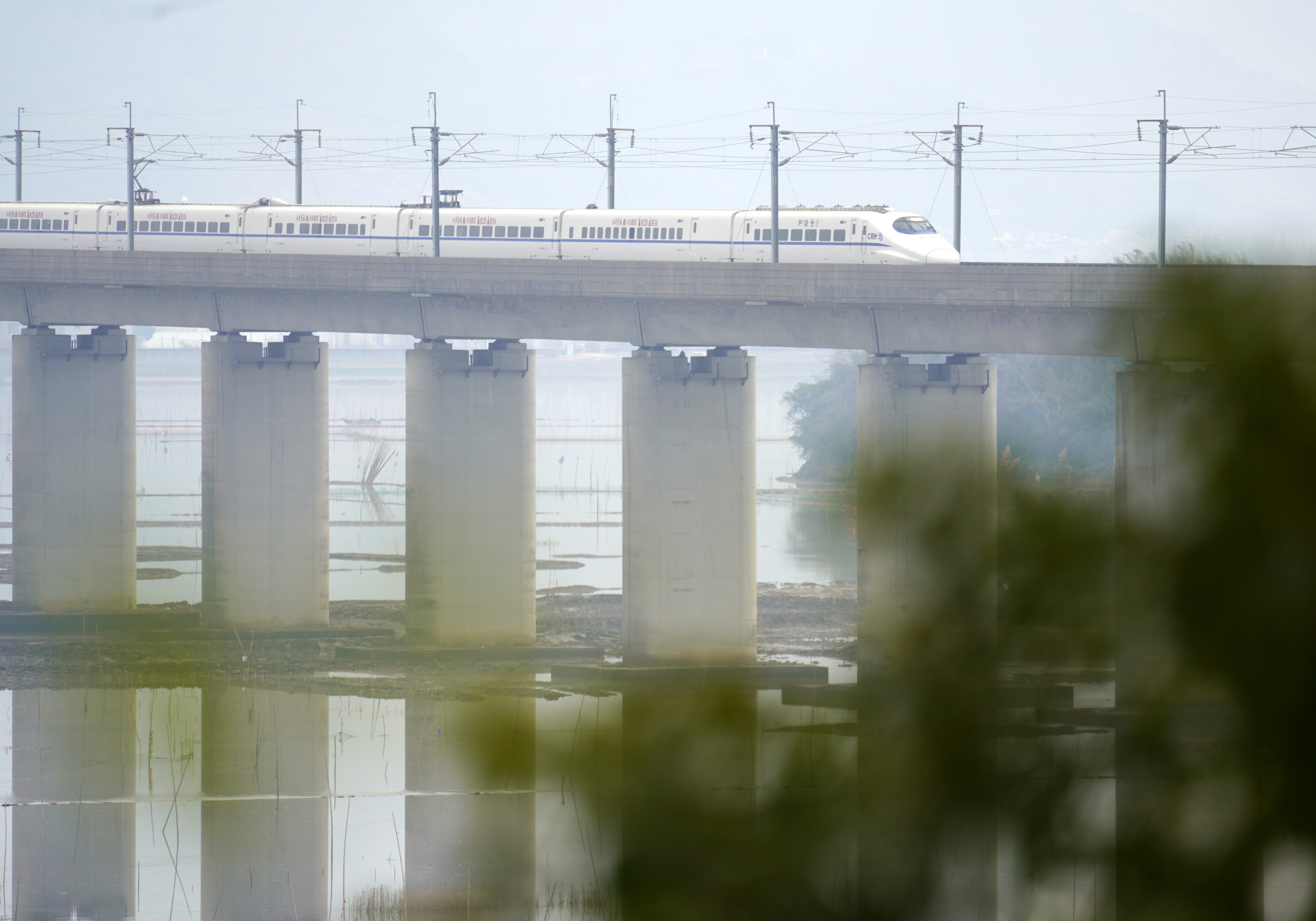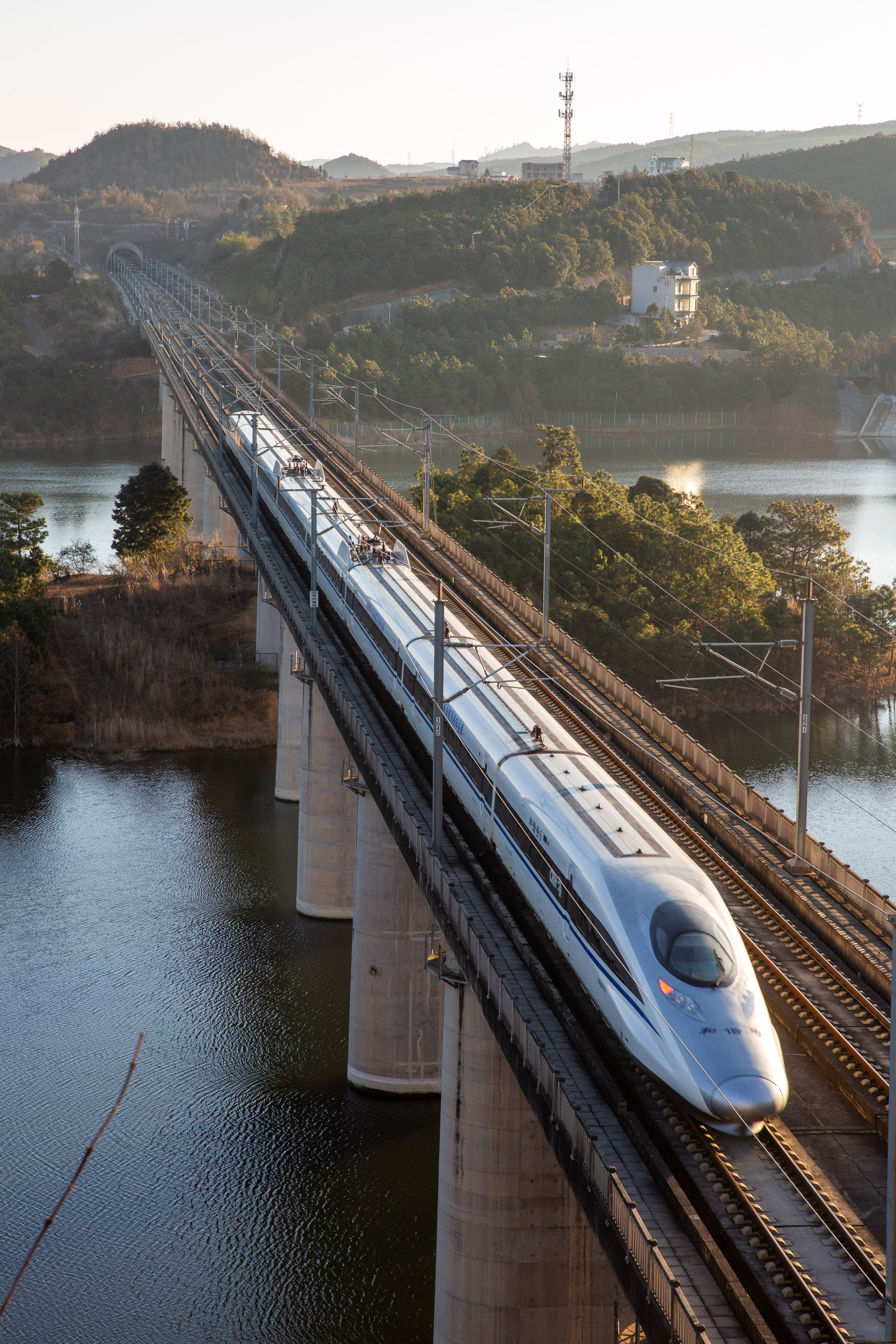 ↑ 1月25日,动车组列车从云南省曲靖市马龙区旧县街说念车马碧水库上驶过。新华社发(杨俊鹏 摄)