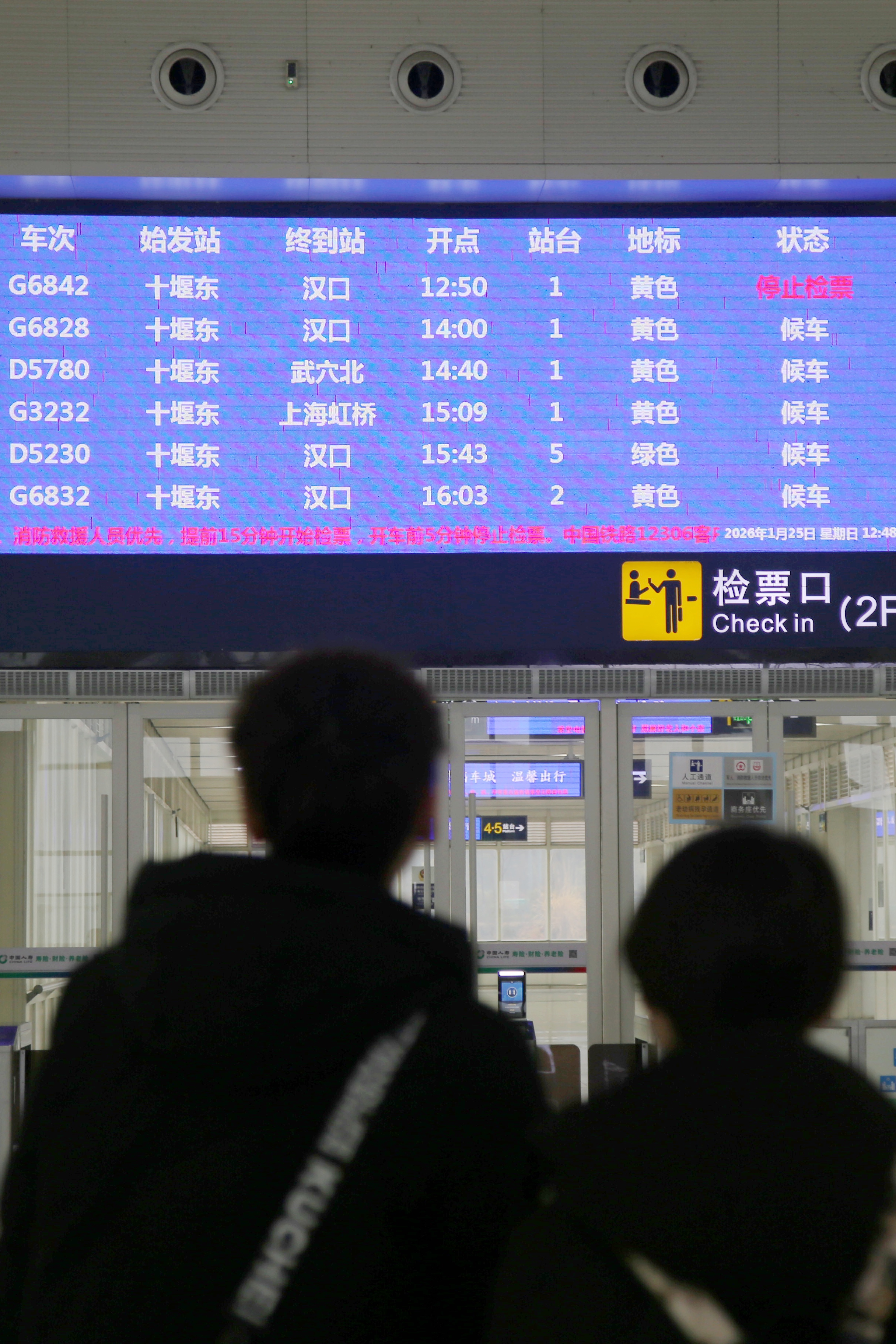 ↑ 1月25日,游客在湖北十堰东高铁站搜检车次。新华社发(曹忠宏 摄)