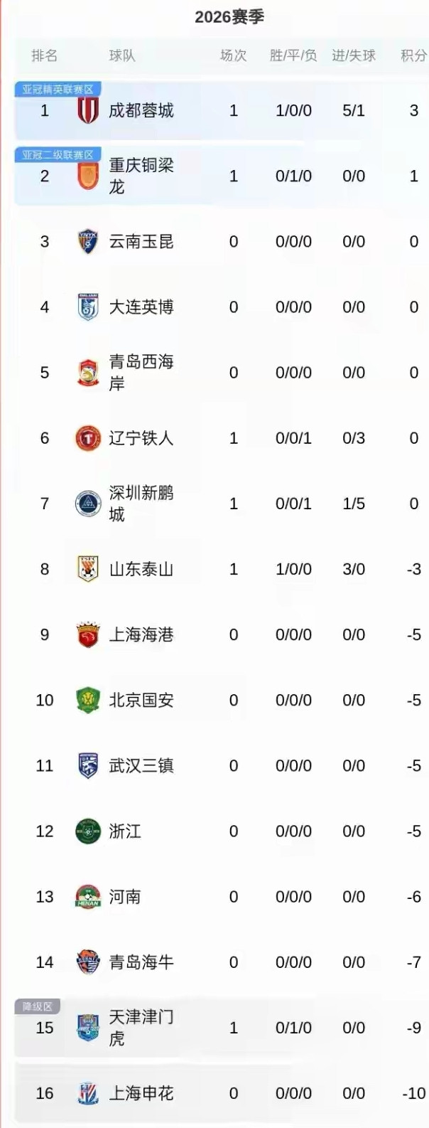 2026赛季中超首轮战罢,一张前所未见的积分榜震荡出炉。山东泰山主场3-0完胜辽宁铁东谈主,却依旧停留在-3分;天津津门虎主场与重庆铜梁龙互交白卷,积分仅从-10分变为-9分,位列倒数第二。赢球不转正、拿分先填坑,成为本赛季中超最确切的写真。