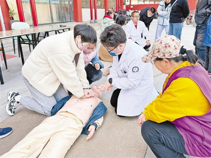 医护东谈主员示范心肺复苏操作门径。本报通信员李堤防